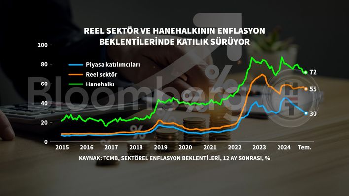 Türkiye Cumhuriyet Merkez Bankası'nın (TCMB) sektörel enflasyon beklentileri raporuna göre Temmuz ayında 12 ay sonrası yıllık enflasyon beklentileri hanehalkı için 0,5 puan artarak yüzde 72 seviyesine yükseldi.