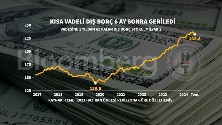 2024 Temmuz sonu itibarıyla, orijinal vadesine bakılmaksızın vadesine 1 yıl veya daha az kalmış dış borç verisi kullanılarak hesaplanan kalan vadeye göre kısa vadeli dış borç stoku, 232,8 milyar dolar düzeyinde gerçekleşti.