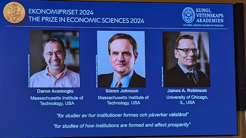 Açıklamada, 2024 Nobel Ekonomi Ödülü’nü, kurumların oluşumu ve refaha etkilerine ilişkin çalışmalarından dolayı Türk Prof. Dr. Daron Acemoğlu, İngiliz Prof. Dr. Simon Johnson ve İngiliz Prof. Dr. James Robinson’un kazandığı bildirildi.