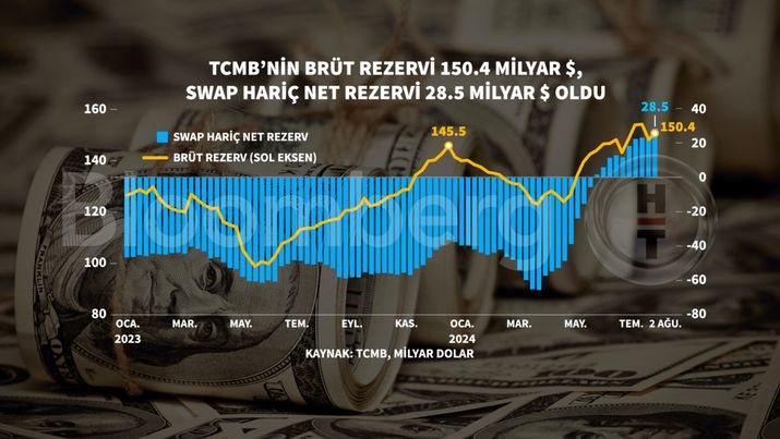 TCMB verilerine göre, brüt rezervler 2 Ağustos ile biten haftada 150,4 milyar dolar seviyesine yükseldi. Bir önceki hafta brüt rezervler 148 milyar dolar düzeyindeydi.