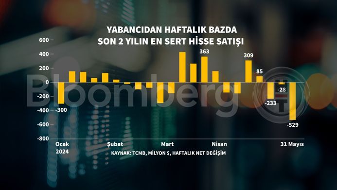 Türkiye Cumhuriyet Merkez Bankası'nın (TCMB) verilerine göre 31 Mayıs haftasında yabancı yatırımcı 528,8 milyon dolarlık hisse sattı. Yabancı geçen hafta 27,9 milyon dolarlık, önceki haftada da 232 milyon dolarlık hisse satmıştı.